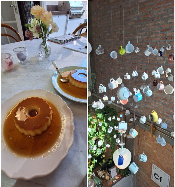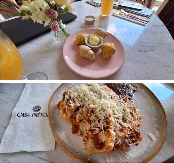 Como chegamos no horário do almoço, fomos direto para o prato do dia: um ravióli de queijo com molho e proteína à escolha. Mas antes disso, fomos surpreendidas com uma cortesia da casa: quatro mini croissants com um sabor absolutamente único, crocantes, levemente temperados, simplesmente inesquecíveis. De sobremesa, um mini pudim que beira a perfeição, com um leve toque de canela que conquistou nosso coração.