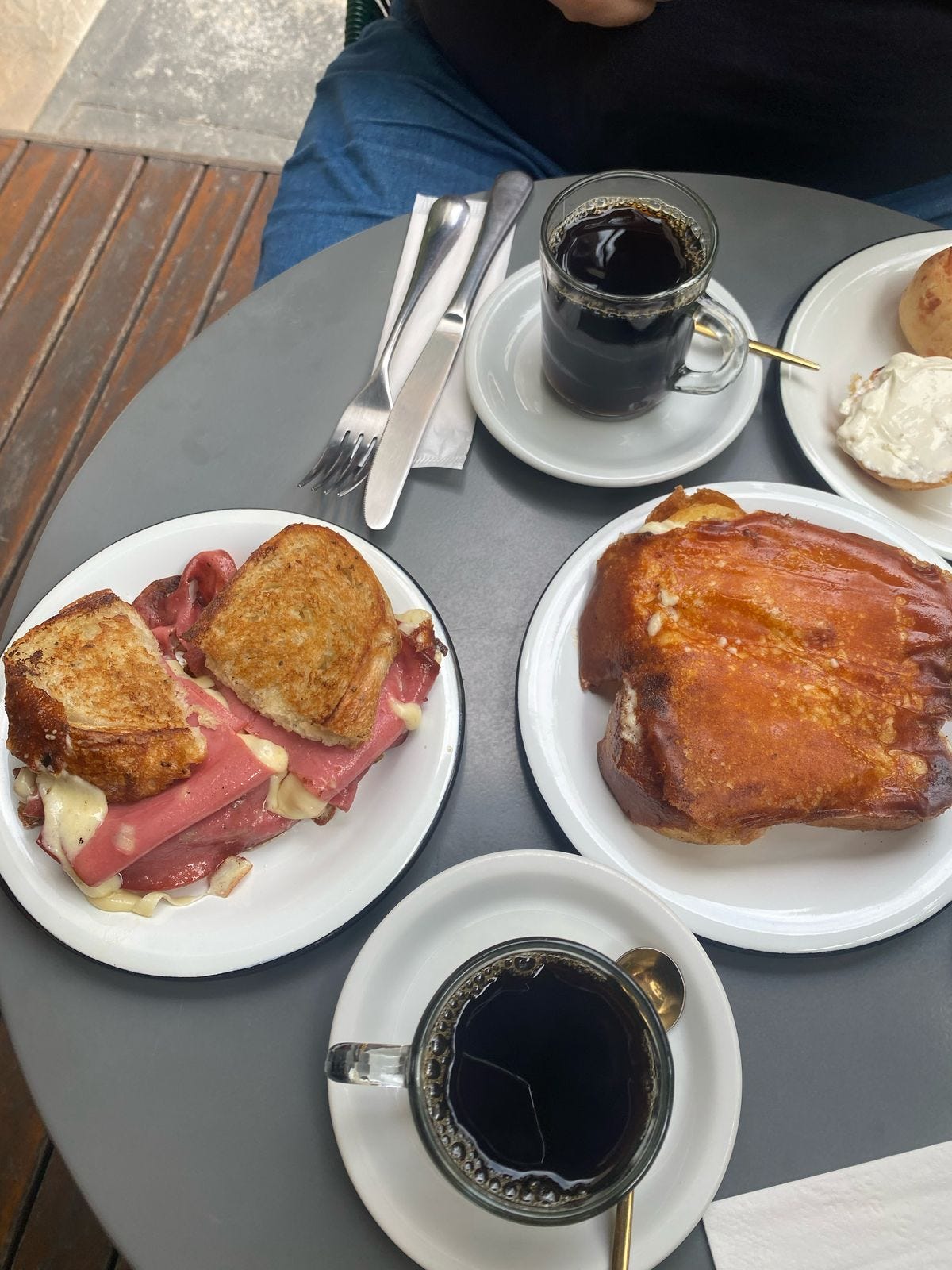 Além do astro principal do nosso brunch pedimos pão de queijo na chapa com catupiry, queijo quente no brioche, café coado e bolo de queijo com goiabada. Tudo delicioso, fresquinho e preparado com muito capricho. O atendimento da casa é excelente também.