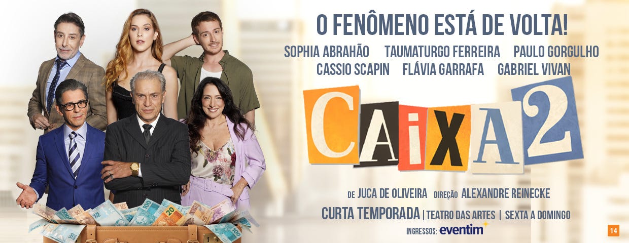 A comédia “Caixa 2”, de Juca de Oliveira, com direção de Alexandre Reinecke e assistência de direção de Edgar Benitez, teve sua estreia em 17 de abril no Teatro das Artes, em São Paulo. A montagem reúne um elenco de peso, com Paulo Gorgulho, Cassio Scapin, Taumaturgo Ferreira, Sophia Abrahão, Flávia Garrafa e Gabriel Vivan. Em cena, uma trama atual e cheia de reviravoltas acompanha personagens presos em uma engrenagem de decisões equivocadas que saem do controle, para desespero deles e diversão do público.