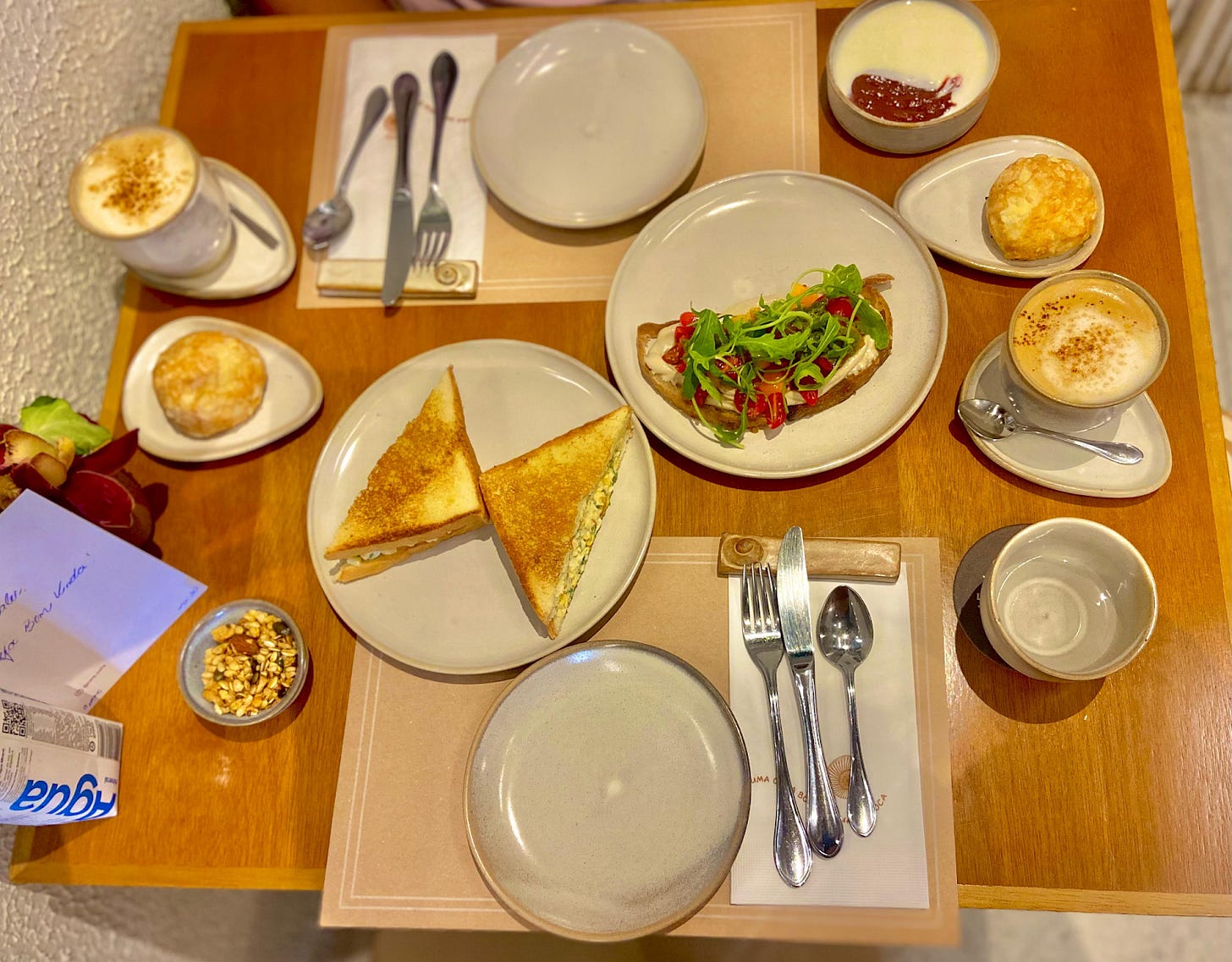 Conhecemos a experiência Caracolla para 2 pessoas (R$188). Essa opção contempla café, latte ou ice tea - podendo escolher duas sugestões. O menu de cafés e lattes são incríveis e foi difícil decidir entre tantas opções saborosas, mas ficamos com o Capuccino Carolla, feito com café, chocolate (o finalzinho dá até para comer de colher de tão delicioso), canela e leite de aveia e o Cappuccino clássico (sem chocolate). Nesse banquete você também pode escolher entre salada de frutas ou iogurte com calda e granola, que foi o nosso pedido, incluindo uma calda de goiabada muito saborosa. Para comer, as pedidas foram os pães de queijo Caracolla, o Toast Caprese e o Sanduíche Egg, elaborado com ovos orgânicos, maionese da casa, no brioche artesanal. Tudo estava uma delícia e o toast ganhou o nosso coração com um molhinho pesto extremamente apetitoso.