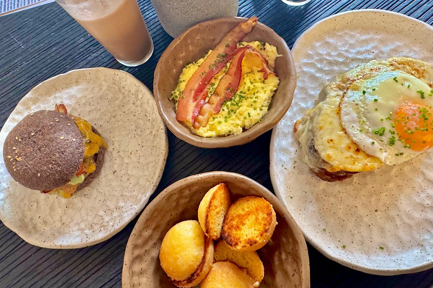 Experimentamos o pão de queijo, que é vegetariano, low carb e proteico, feito com farinha de amêndoa, proteína, parmesão e ovos. Ele vai na chapa com ghee e chega quentinho na mesa (R$25). Outros clássicos do menu que degustamos foram os ovos mexidos com opções de diversos adicionais - escolhemos bacon e muçarela; o Croque Madame com a gema perfeita (R$47) e a nossa escolha mais diferente foi o Cheat Day Burger, que estava extremamente saborosa e foi o nosso favorito. É um blend de hambúrguer, cheddar inglês, bacon artesanal e pão low carb (R$55).