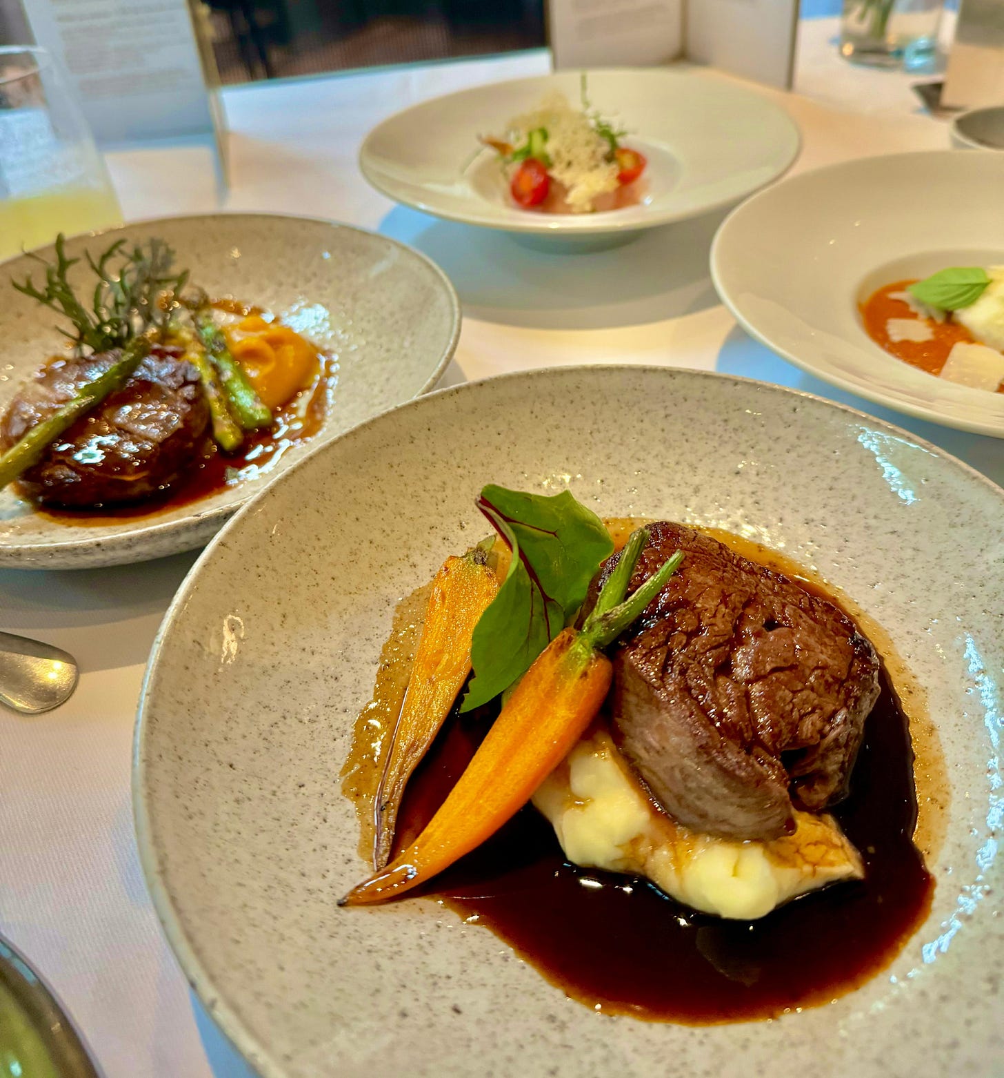 Ufa… mas ainda não acabou! Agora vamos aos pratos principais, né!? Dentre as cinco opções disponíveis, nós pedimos a polenta assada com molho de queijo tulha - ela é servida com cogumelos, mas pedimos sem o ingrediente. Acho que nunca experimentamos uma polenta tão saborosa, o queijo tulha faz toda a diferença complementando essa experiência no paladar. Também experimentamos o Cordeiro assado, extremamente macio e desmanchando na boca! Ele acompanhava um delicioso creme de abóbora. E para encerrar a nossa experiência nos pratos principais pedimos também o filé mignon com purê de cará e molho roti. Um verdadeiro sabor brasileiro! Carne no ponto certo e também super macia.