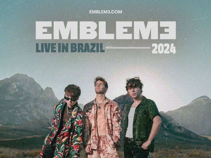 Emblem3 estará no Brasil daqui duas semanas para cumprir uma agenda de shows em algumas cidades. Após dez anos longe do país, a banda norte-americana formada por Wesley Stromberg, Drew Chadwick e Keaton Stromberg, volta com a "Emblem3 Live In Brazil", passando por São Paulo, Rio de Janeiro, Curitiba e Belo Horizonte.
