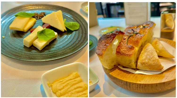 O menu é servido em 6 etapas. Começamos pelo couvert com entre as foccacias artesanais de fermentação natural - quentinho, com uma massa extremamente leve, deliciosa - e uma seleção de queijos artesanais