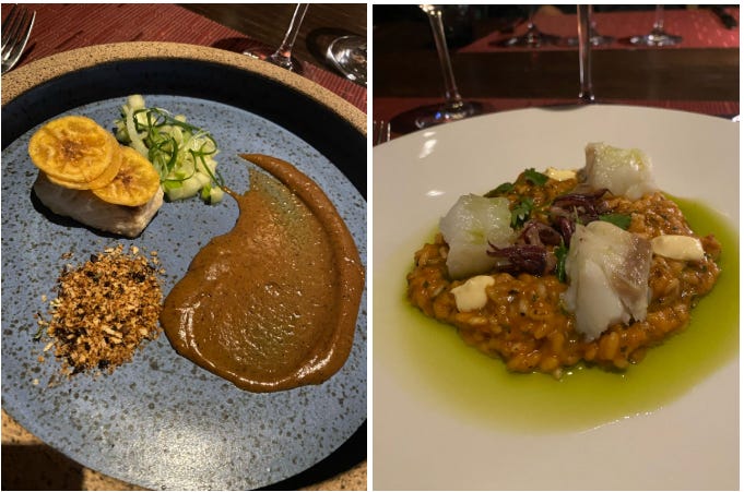 Nos principais, difícil escolher qual ganhou mais o nosso coração: Peixe com banana (peixe grelhado com chips de banana, purê de banana da terra, vinagrete de maçã verde e erva doce e farofa crocante de maracujá) e Arroz meloso de tomate e bacalhau. Vale ressaltar que o purê de banana da terra ganhou demais o nosso estômago rs e os sabores marcantes do arroz meloso foram certeiros para o nosso paladar. Simplesmente perfeitos.