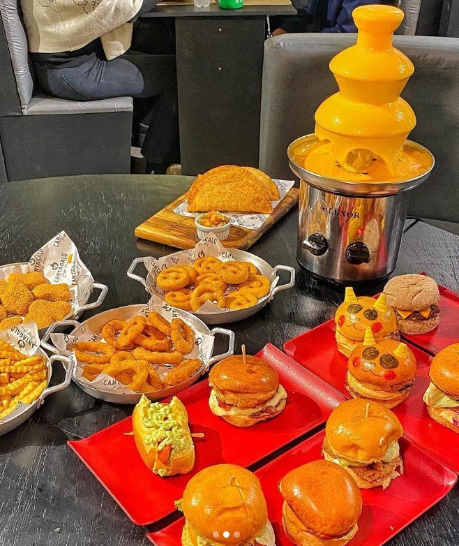 Neste mês fomos conhecer a hamburgueria da torre de cheddar - a Cantagalo Burger, que conta com duas unidades, uma no Tatuapé (unidade visitada) e outra em Santana. É fartura que vocês procuram? Pois lá vocês encontram! Eles possuem um rodízio de mini burger com 18 opções de sanduíches (tem até hot dog), entradinhas como fritas, anéis de cebola e nuggets, além de sandubas doces como o de prestígio e o Doce Caram (juro que não aguentamos chegar nessa parte).