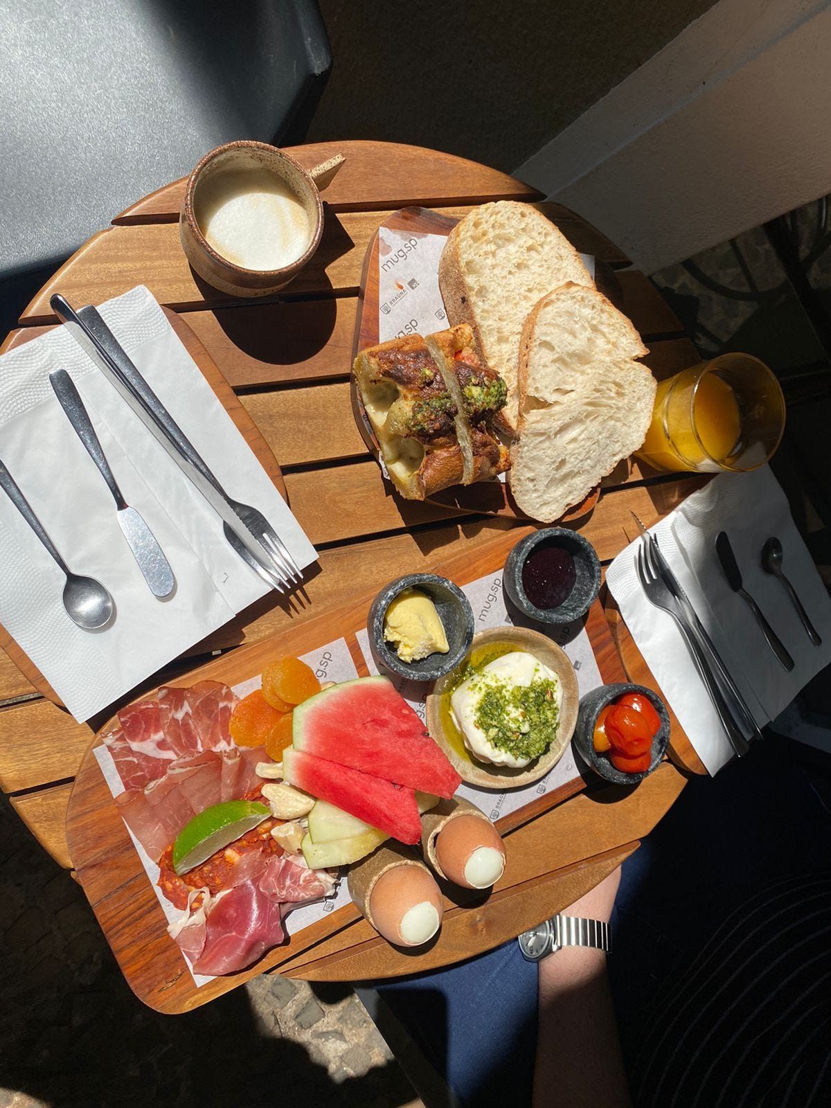 Escolhemos o combo “Brunch for 2” (R$142), que serve muito bem duas pessoas, e inclui frutas frescas, seleção de charcutaria artesanal, oleaginosas, ovos orgânicos, tomate confitado, geléia artesanal de frutas, manteiga com flor de sal, queijo da sua escolha - escolhemos burrata fresca coberta com pesto -, e tábua de pães da casa de fermentação natural. No combo também é possível escolher duas bebidas, entre as opções: espresso, duplo, macchiato, cappuccino, coado, latte ou suco natural de laranja.