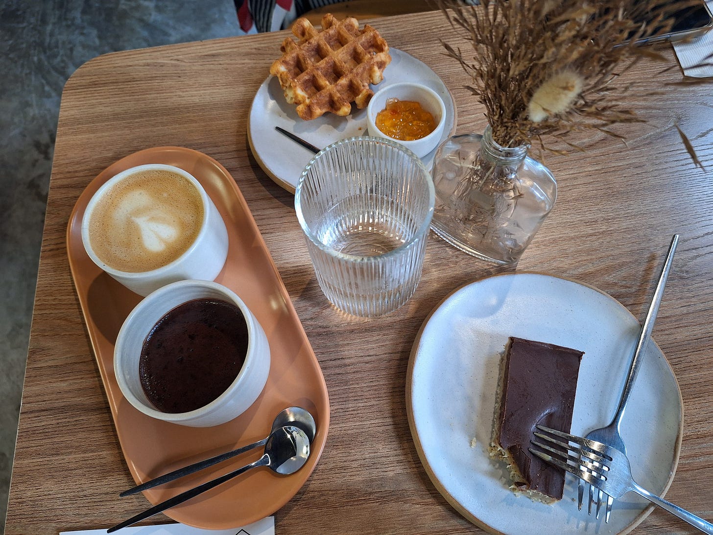 A waffle que estão vendo na foto é na verdade um delicioso pão de queijo (R$ 15), que acompanha geleia de laranja (nossa escolha) ou manteiga com sal. Por menos de cinco reais, incluímos a barrinha de caramelo, com base de biscoito amanteigado e côco, coberto com chocolate meio amargo.