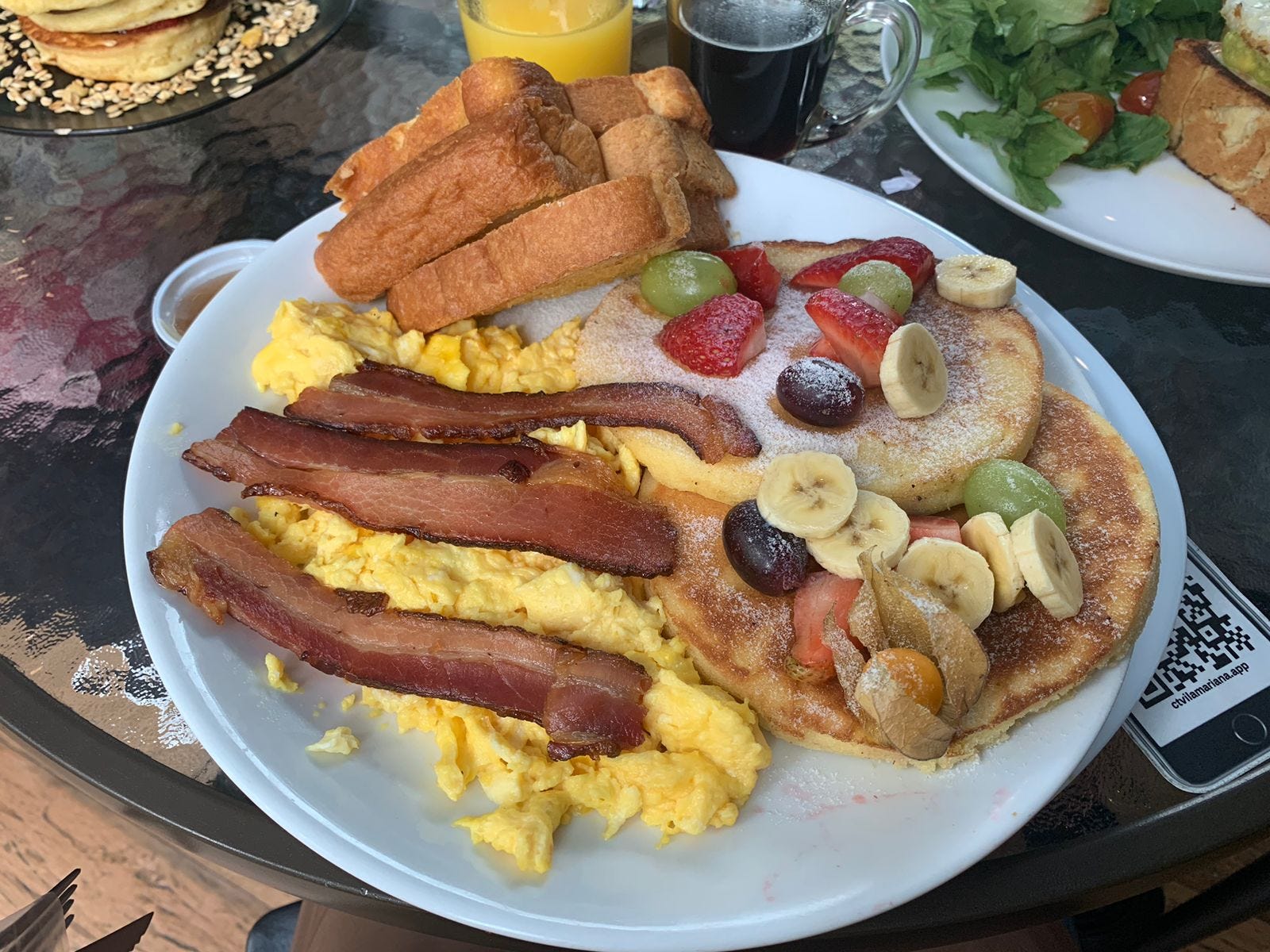 Pedimos três opções. O Nutella Pancakes (R$ 29,90): com banana, morangos e granola; Avocado Toast Brunch (R$49,90): regado com azeite, cream cheese, guacamole, tomate confit e ovo estalado; American Breakfast (R$ 60,90): ovos mexidos com bacon, torradas, panquecas, frutas, frosting, mel e manteiga. Este acompanha café e suco de laranja.