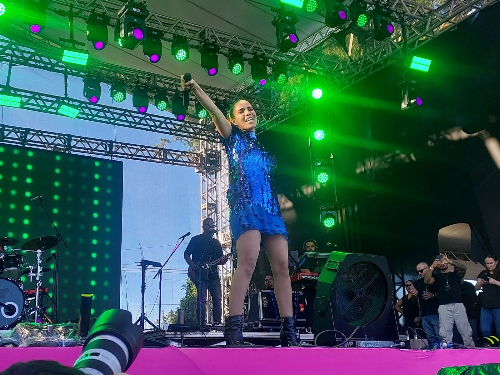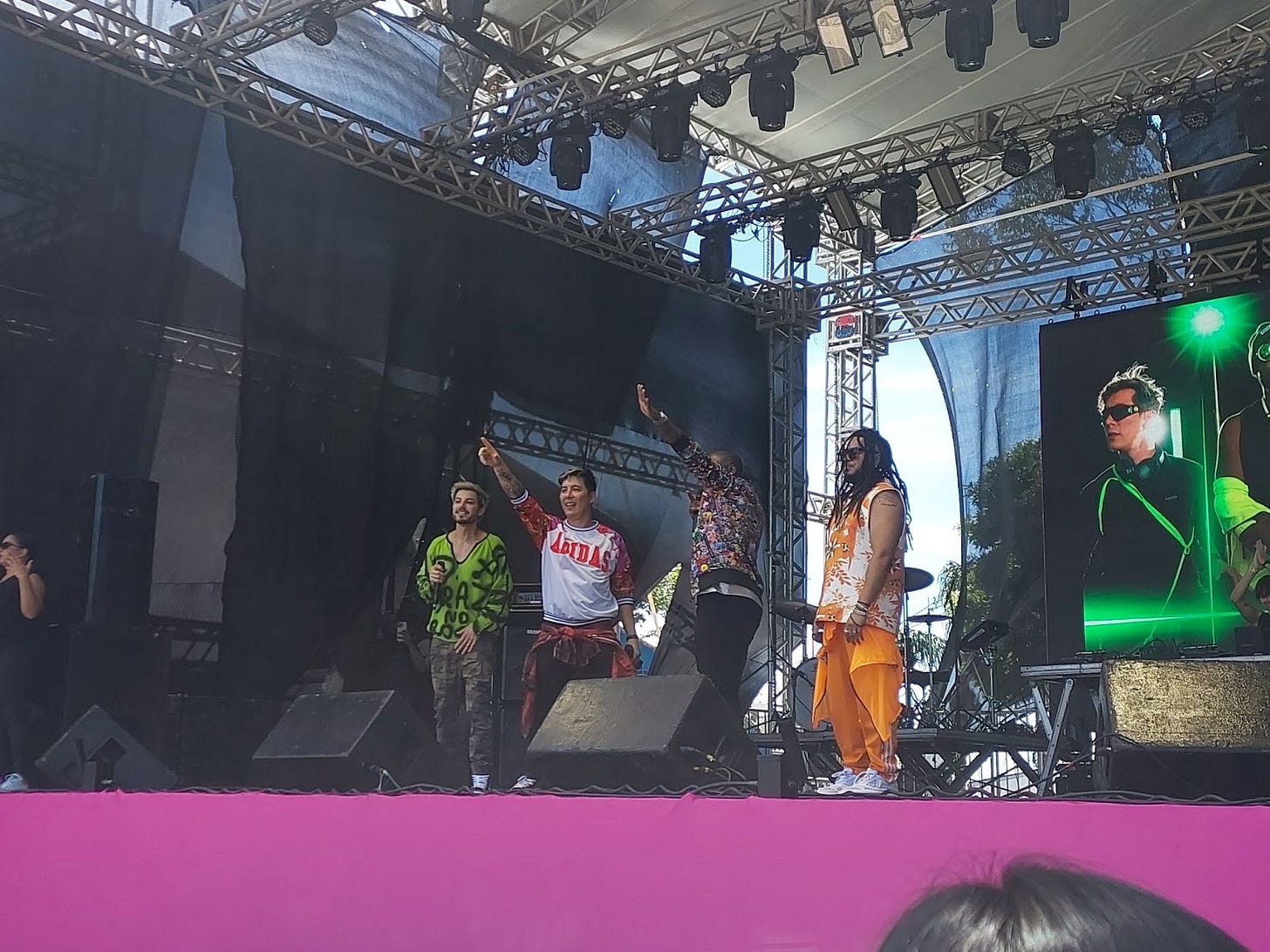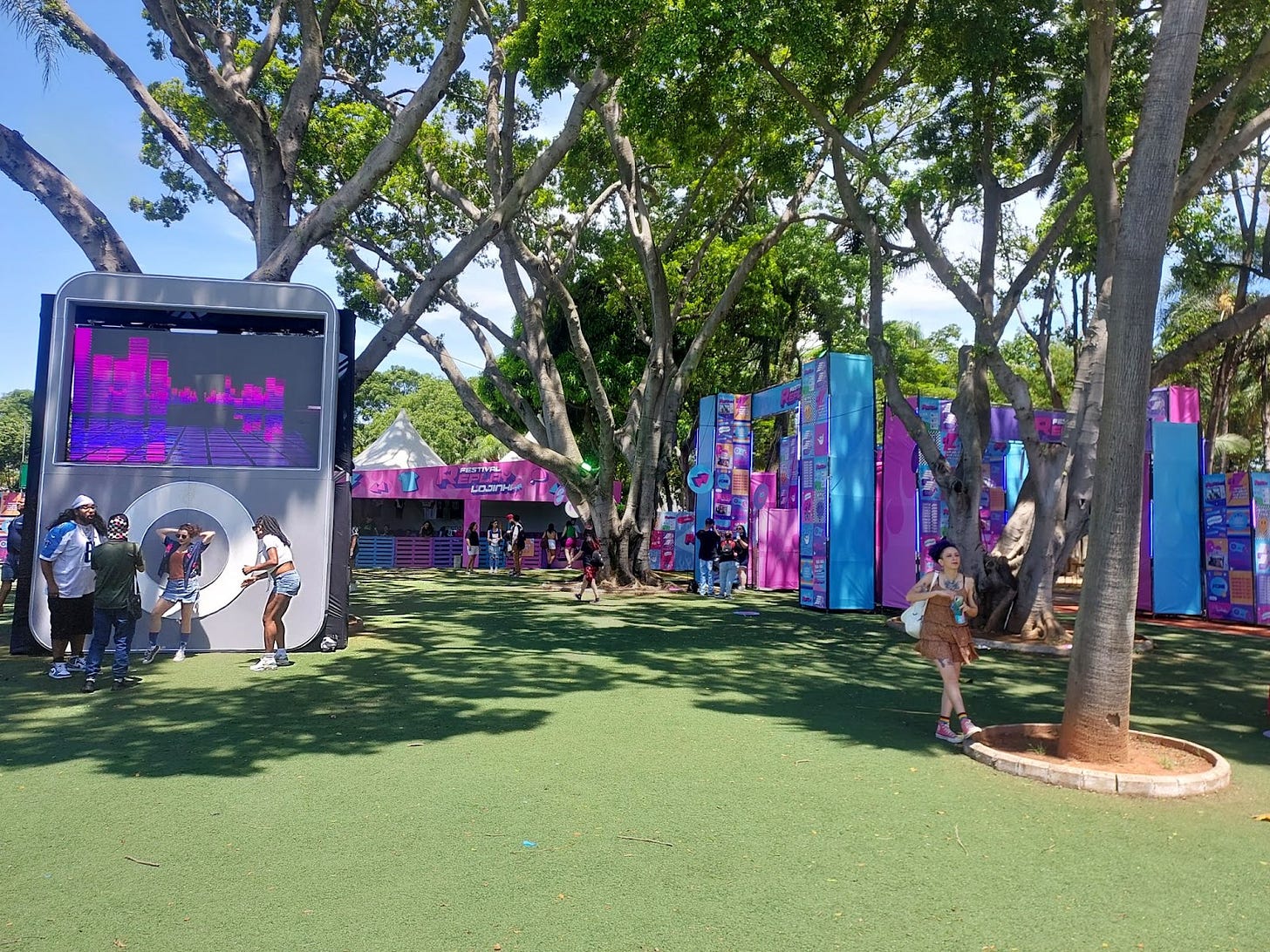 O festival começou com atraso de mais ou menos 1 hora, e apesar do calor já tinha uma quantidade boa de pessoas para os primeiros shows. O cenário estava bem bonito, cheio de referências aos anos 2000, com espaços para instagramáveis, ativações com jogos tipo aqueles de parque de diversão de shopping, sabe?