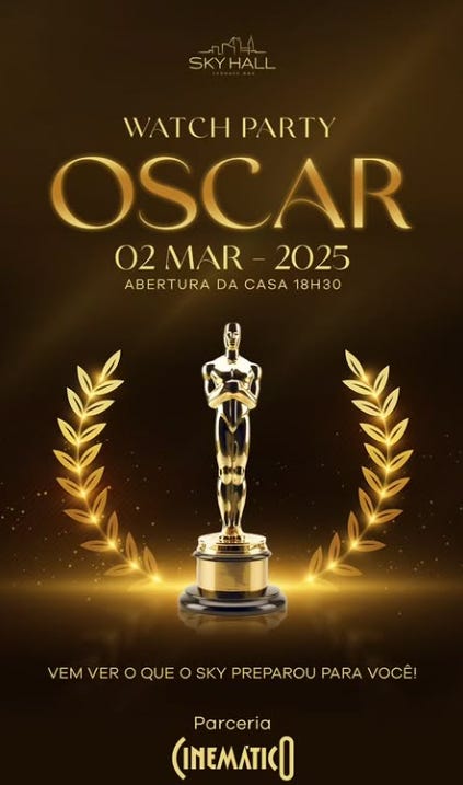 O Sky Hall Terrace Bar promoverá a "Watch Party Oscar 2025" no dia 2 de março, a partir das 18h. O evento contará com diversas experiências como shot gratuito se a Fernanda Torres ou o Filme Ainda Estou Aqui levar o Oscar; um bolão onde os participantes podem concorrer a uma estatueta exclusiva; um menu exclusivo inspirado nos filmes; Welcome Drink de espumante e ainda a presença do Podcast Cinemático com Beatriz Fiorotto e Carlos Merigo. Os ingressos custam R$80, valor consumível, e as vagas são limitadas. Ingressos disponíveis pelo Sympla.