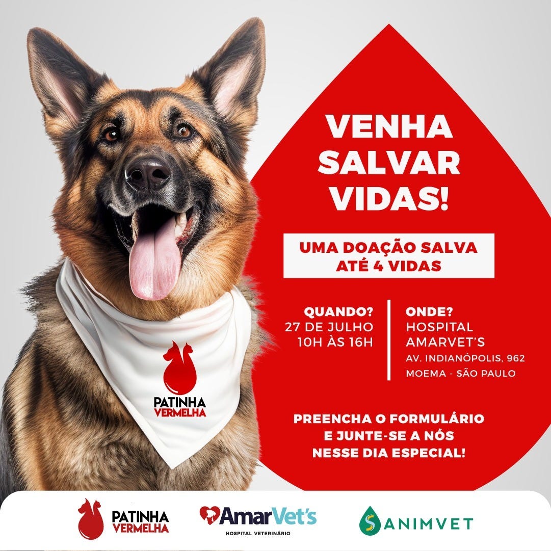 O AmarVets Hospital Veterinário, localizado no bairro de Moema, realizará no dia 27 de julho, das 10h às 16h, a Campanha Patinha Vermelha, um evento destinado à doação de sangue entre os cães. Idealizada com o propósito de promover a saúde e o bem-estar dos animais, a campanha visa salvar vidas de pets que necessitam de transfusões de sangue para procedimentos médicos, e conscientizar as pessoas da importância da doação.