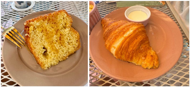 Para beber, café coado, aromático e bem extraído, e suco de laranja fresco, daqueles que lembram café da manhã em família. Para finalizar, uma generosa fatia de bolo! Escolhemos o de laranja com calda, úmido, perfumado e com aquele toque cítrico equilibrado que abraça o paladar.