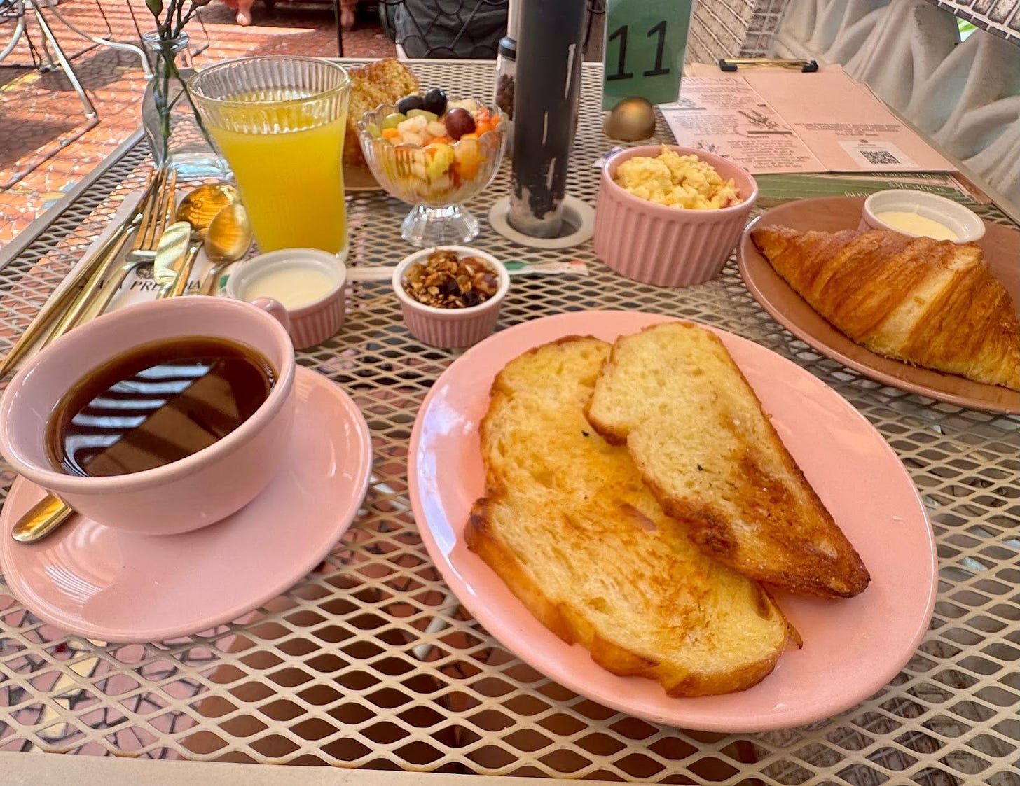 A experiência começa com uma salada de frutas fresca e colorida, acompanhada de iogurte e granola. Os ovos mexidos, cremosos na medida certa, vêm com tomatinhos-cereja e queijo branco, trazendo sabor e suavidade. Tudo isso servido com pão de fermentação natural, macio por dentro e com casquinha crocante, além de croissant que pode ser combinado com requeijão ou geleia.