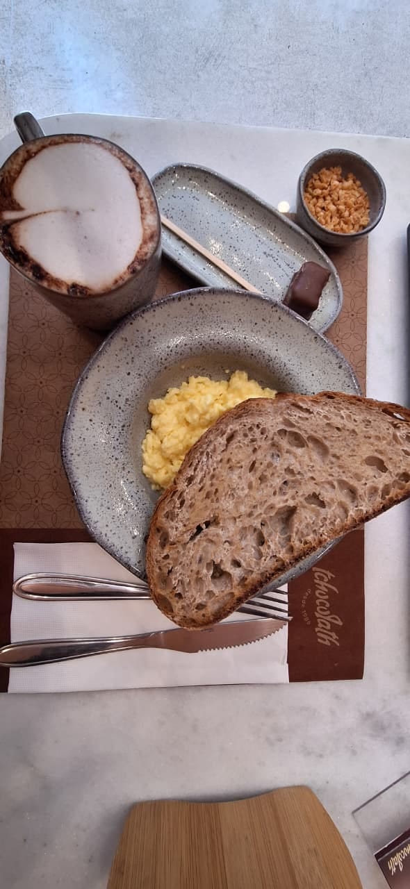 O café da manhã começou com ovos mexidos acompanhados de pão rústico de fermentação lenta e farofinha de pão de queijo. Um prato simples, mas cheio de personalidade: o pão surpreende pela leveza e a farofinha traz aquele “tchan” que foge do óbvio. (R$ 34)
