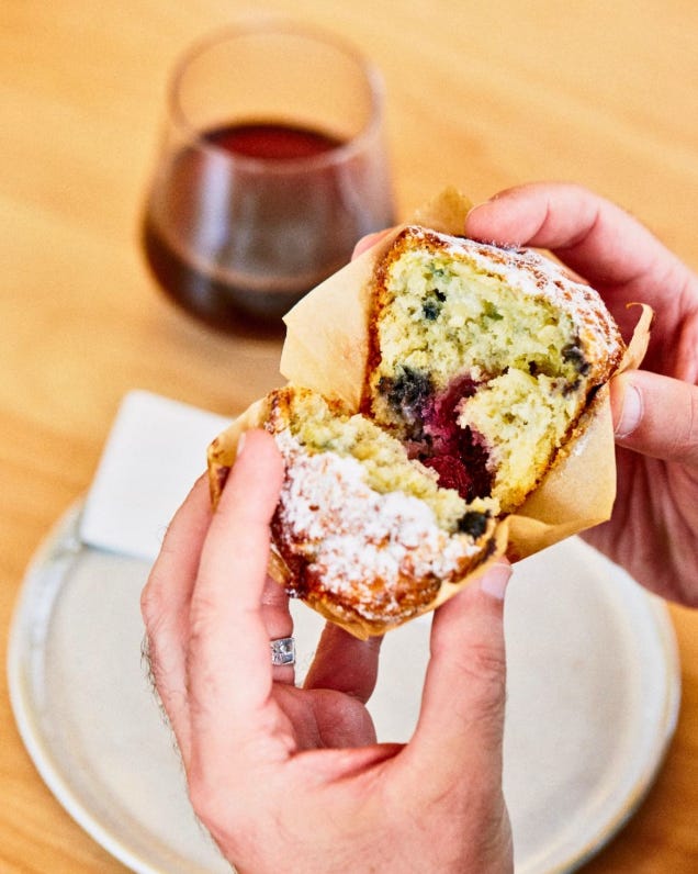 Entre os destaques do cardápio, o muffin de chocolate branco com blueberry merece atenção especial: macio, equilibrado e irresistível, daqueles que pedem uma pausa só para aproveitar cada mordida. O café HM é uma ótima descoberta para quem busca bons cafés, boas leituras e um respiro no coração do Centro.